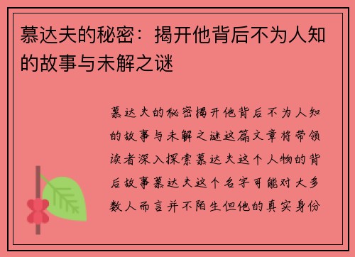 慕达夫的秘密:揭开他背后不为人知的故事与未解之谜
