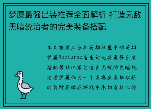 梦魇最强出装推荐全面解析 打造无敌黑暗统治者的完美装备搭配