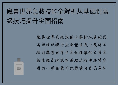 魔兽世界急救技能全解析从基础到高级技巧提升全面指南
