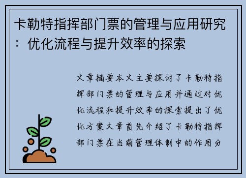 卡勒特指挥部门票的管理与应用研究:优化流程与提升效率的探索